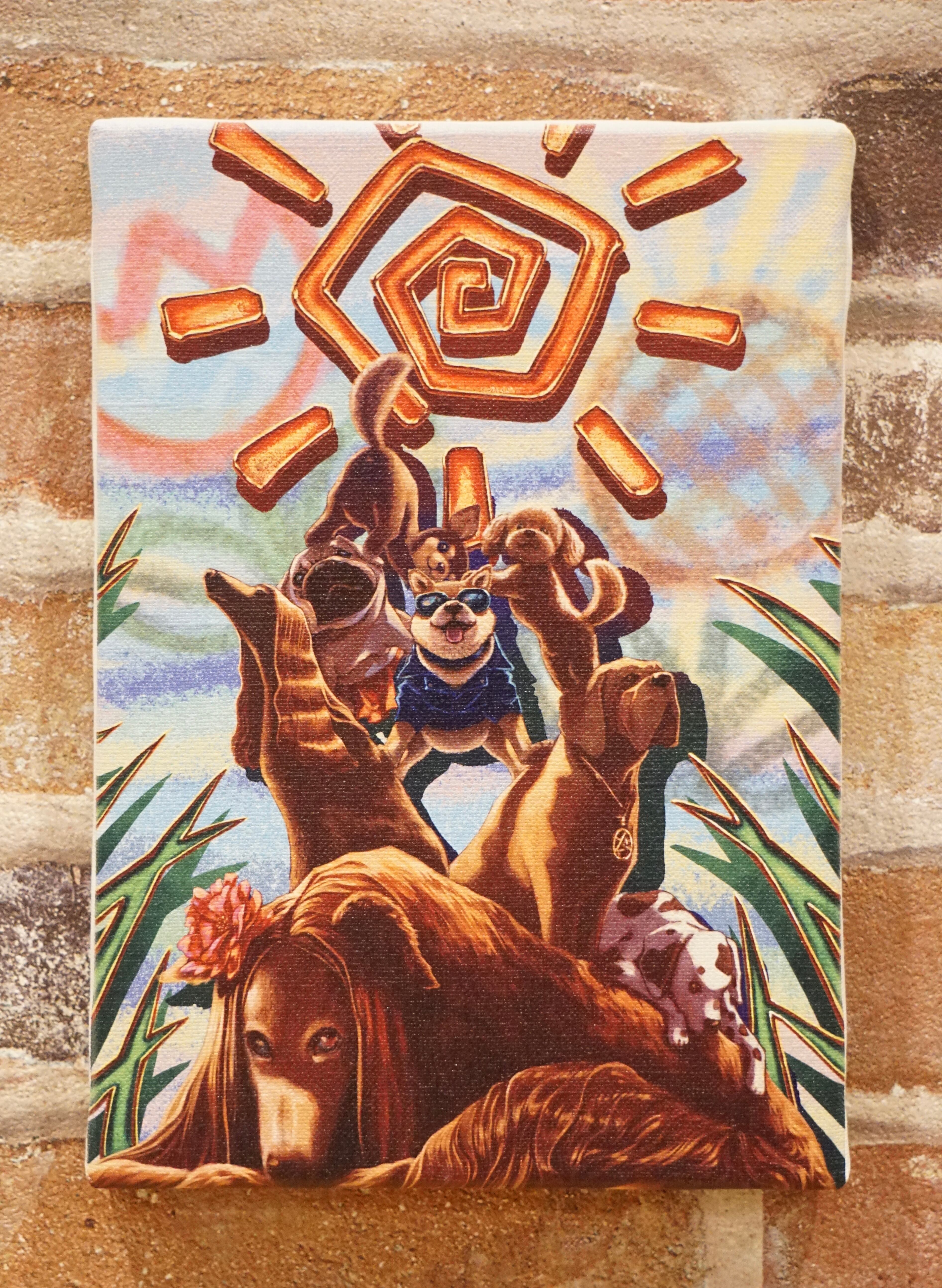 可愛らしい犬たちが描かれたデジタルキャンバスプリント作品。